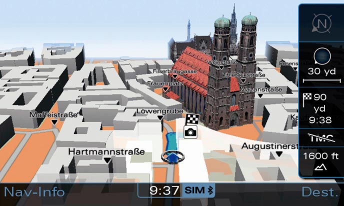 Route planning and guidance using voice, pictogram and 3D mapping.