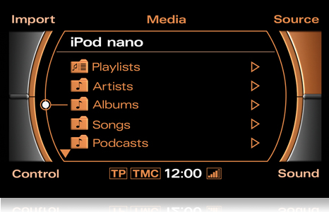 Thousands of songs available at your fingertips: the Audi music interface integrates portable media players into the Audi RNS-E Navigation. You can select artists, albums, tracks or genres with the RNS-E controls or the multifunction steering wheel. The system is capable of communicating with a wide range of portable media players and USB storage media.