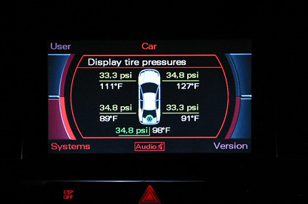 Tyre pressure monitoring systems, which measure directly, use sensors installed in the wheels. These measure the pressure and temperature inside the tyre and transmit this information to a receiver in the vehicle. The measured tyre pressures are continuously compared with specification values, which are entered by the driver, for example after changing the tyres. The driver can not only check the tyre pressures and temperatures at any time, but also receives a warning if differences arise between the set pressure and the measured pressure. Sensors on all four wheels are necessary for the system to function correctly.