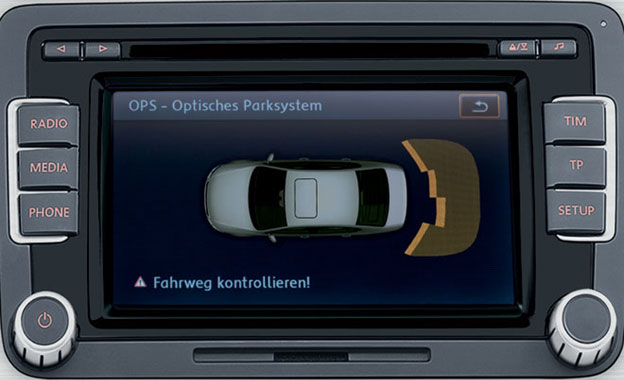 Volkswagen park assist is an optical system, which not only issues acoustic warnings when obstacles are detected, but also a screen report. Measurement is carried out by four ultrasonic sensors concealed in the rear bumper. On the vehicle audio system display, a vehicle body is represented during parking, which indicates various warning symbols.